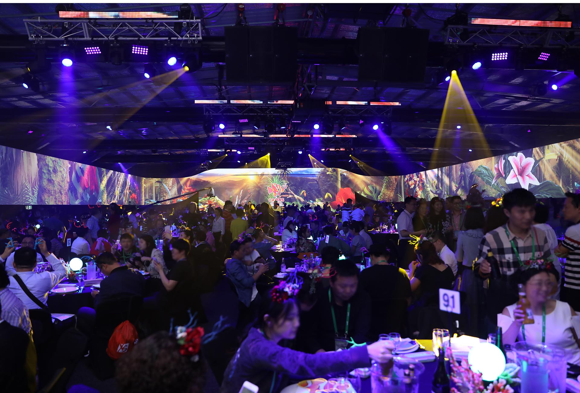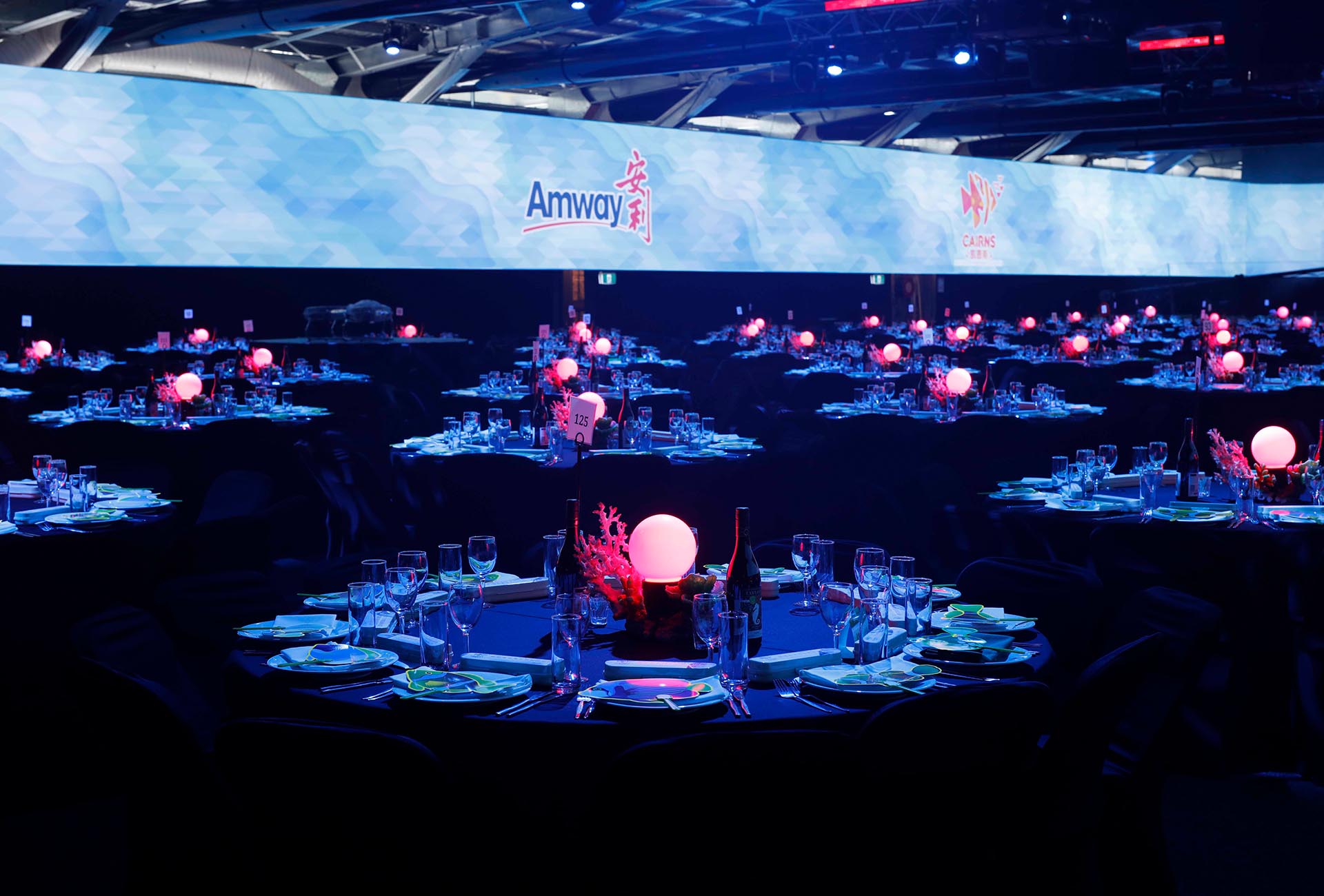 The Rainforest to Reef theme allowed Encore to design four distinct experiences: rainforest, beach, reef and river. Each environment was themed using a 270-degree screen that wrapped around the venue walls, customised soundscapes, roaming performers and reef-inspired table styling which incorporated lighting design. A key performance brought each environment to life and were each enhanced with creative technical production.