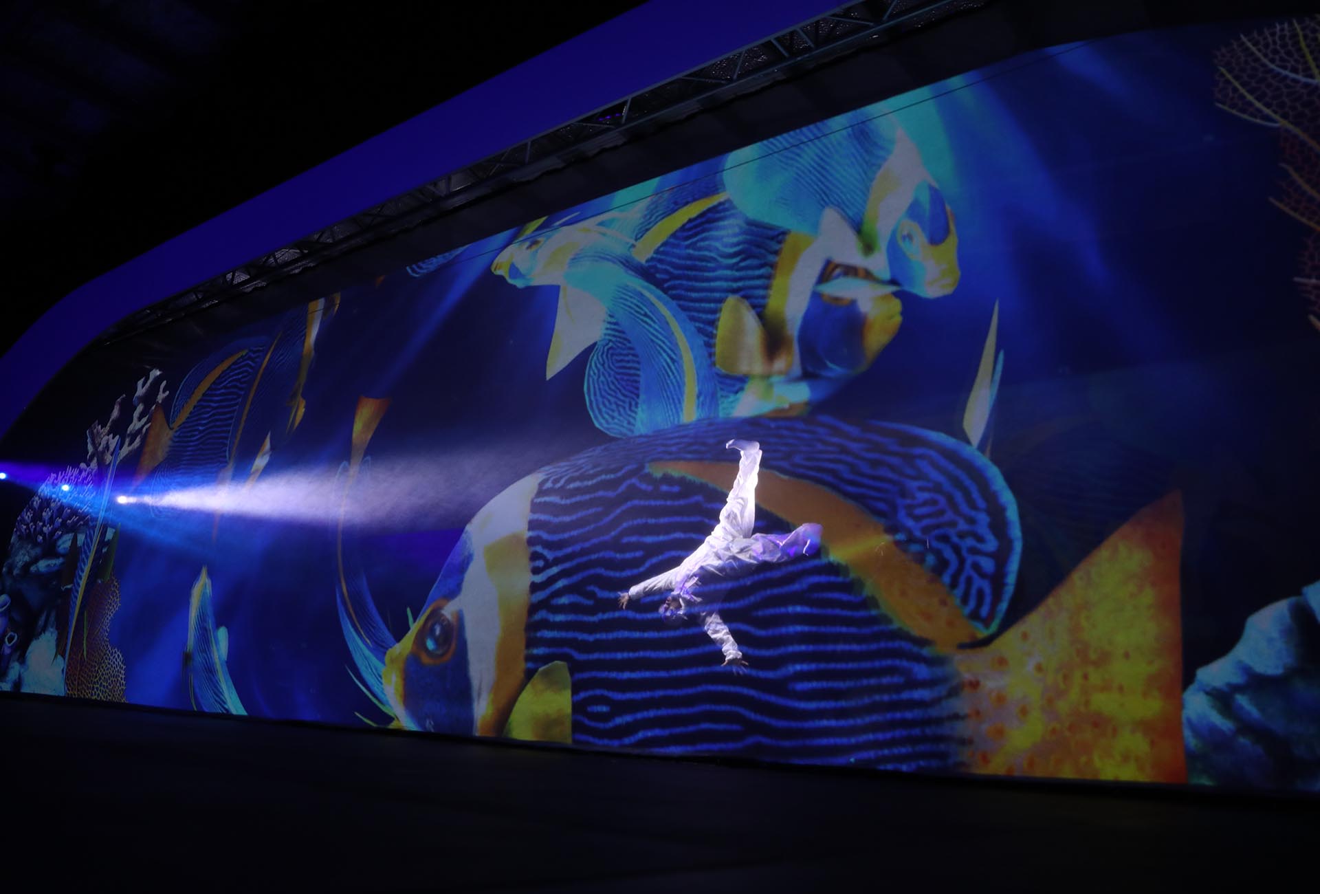 The ‘rainforest’ environment included a thunder and lightning performance by the Million Volt Man, one of the most extreme live performers who uses high-voltage Tesla coil in his stunts. For the ‘river’ component, Encore created a custom ‘Fish Medley’ act which included singing and dancing animated fish on computer-controlled robotic LED screens that moved with the music. The ‘beach’ environment included an artistic Fabric Ballet performance featuring 18 DMX controlled fans with choreographed dancing, while ‘reef’ featured a game simulation of an underwater treasure hunt made possible using a range of AV techniques. The journey saw a live performer participate in the underwater adventure using layered multimedia with a holographic mesh screen, LEDs and choreographed robotics show.
