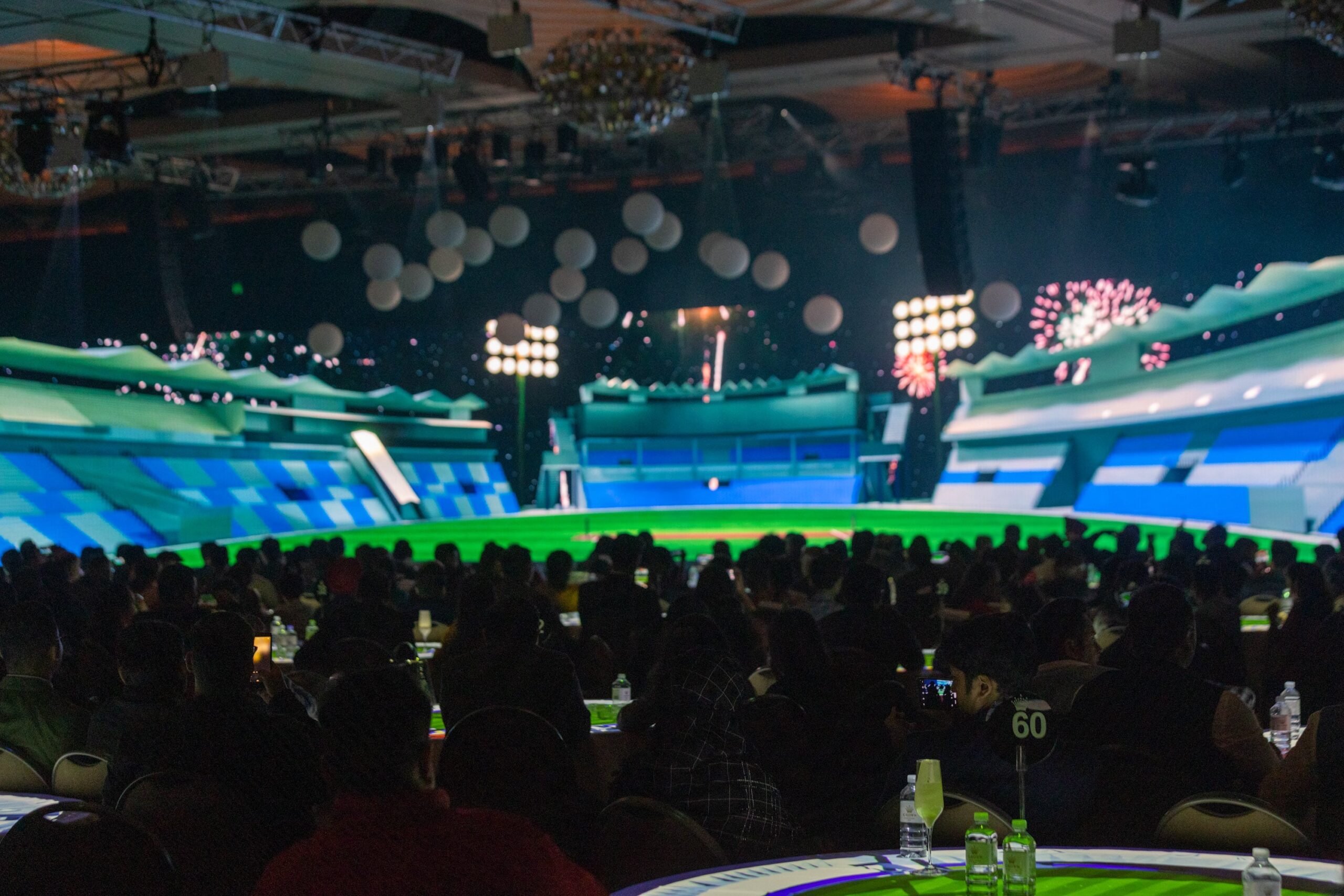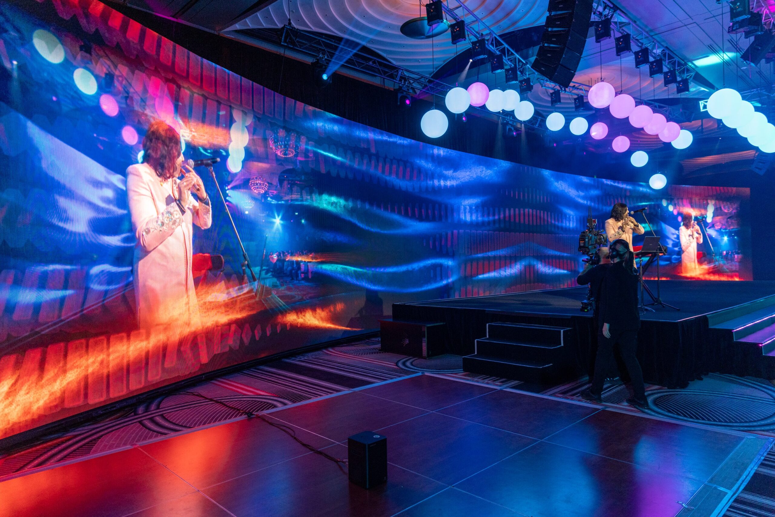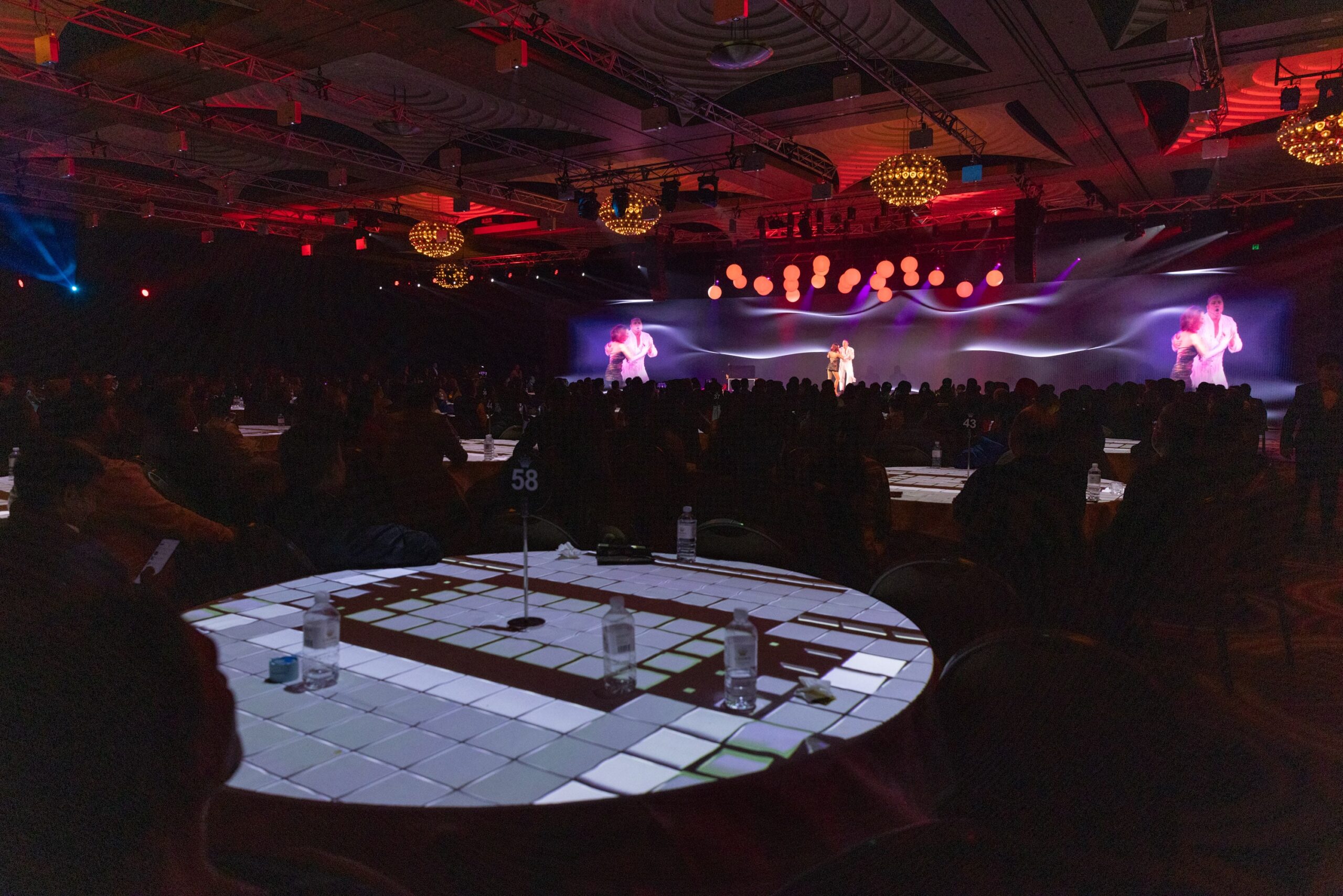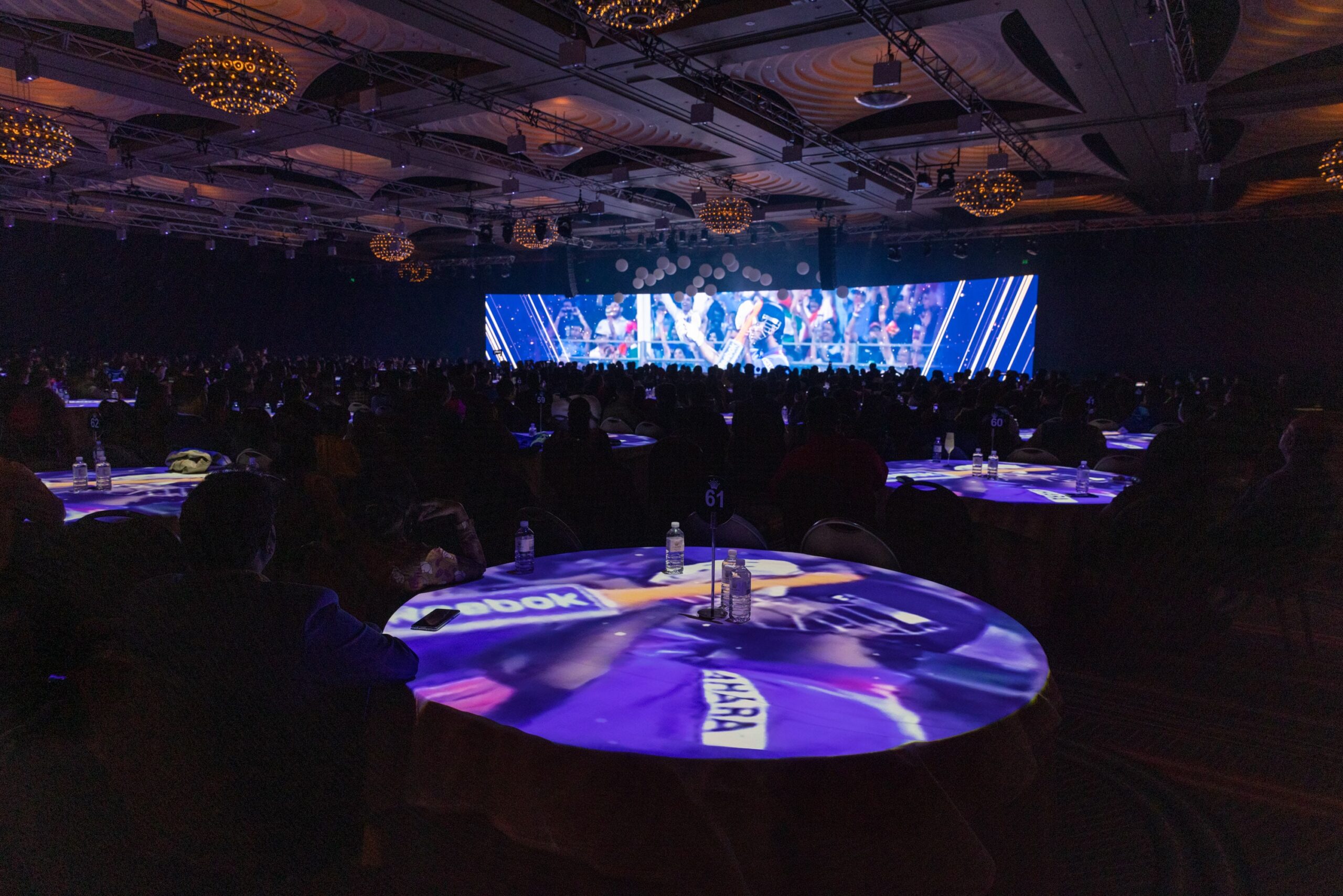 Through the use of kinetic lights, a 22m wide curved screen, table projections and extensive room lighting, the Grand Palladium room at Crown Melbourne gradually transformed and transported the audience to the grounds of the MCG.