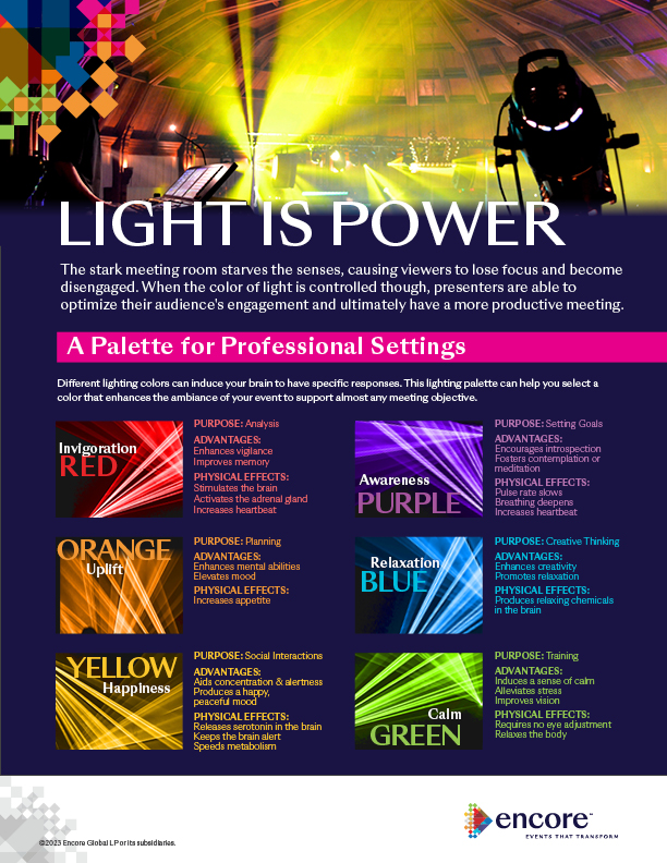 Whether you’re planning a large-scale event or small meeting, our experts can help you choose the right color-creating tech to captivate and impress audiences. Plus, by partnering with a full-service provider like Encore, you’ll have an industry-leading team on your side to provide guidance on enhancing your meeting or event design, creating stunning content, and managing technology before, during and after the production.