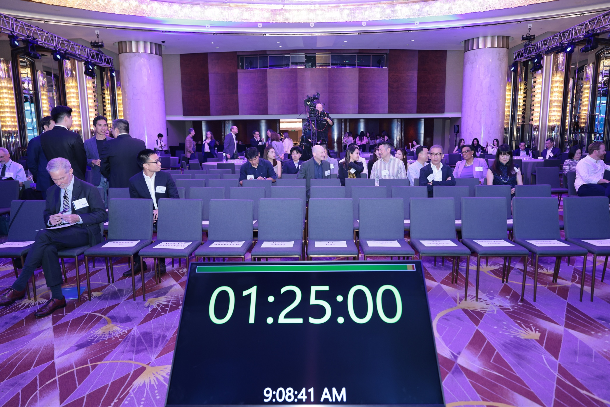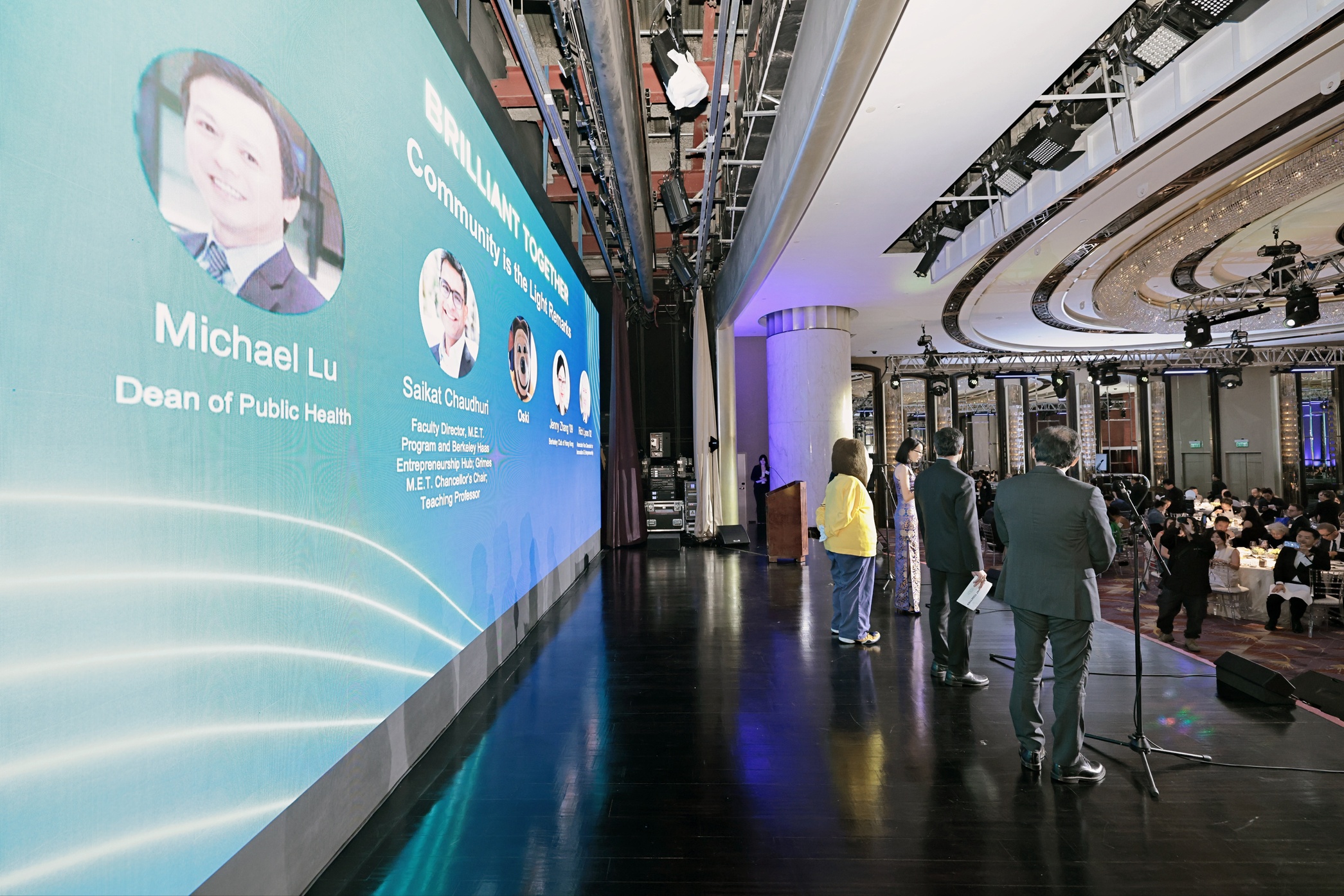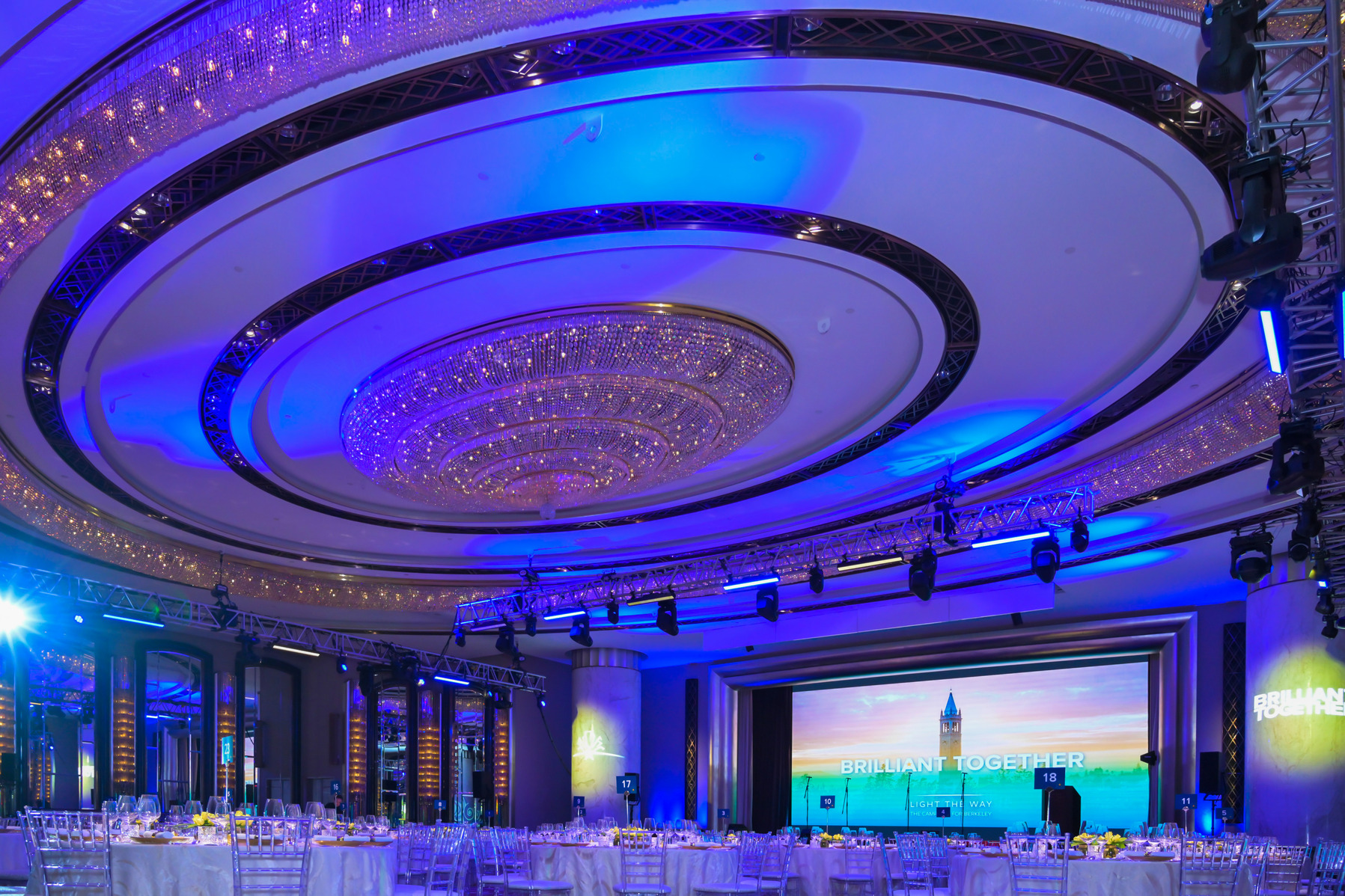 Encore ออกแบบแผนการผลิตที่หลากหลายซึ่งเปลี่ยนห้องแกรนด์บอลรูมเพื่อประสบการณ์ที่แตกต่างกันสองแบบ วันแรกมีฟอรัมวิชาการพร้อมที่นั่งสไตล์โรงละครและอาหารกลางวันสําหรับแขก 140 คน ผนัง LED ที่โดดเด่นทําหน้าที่เป็นฉากหลังบนเวที ในขณะที่โกโบแบบกําหนดเองฉายภาพแบรนด์ของ UC Berkeley ลงบนเสาหินอ่อน พื้นที่นี้อาบด้วยแสงสีน้ําเงินและสีทองอันเป็นเอกลักษณ์ ซึ่งสร้างเอกลักษณ์ทางภาพที่เหนียวแน่น