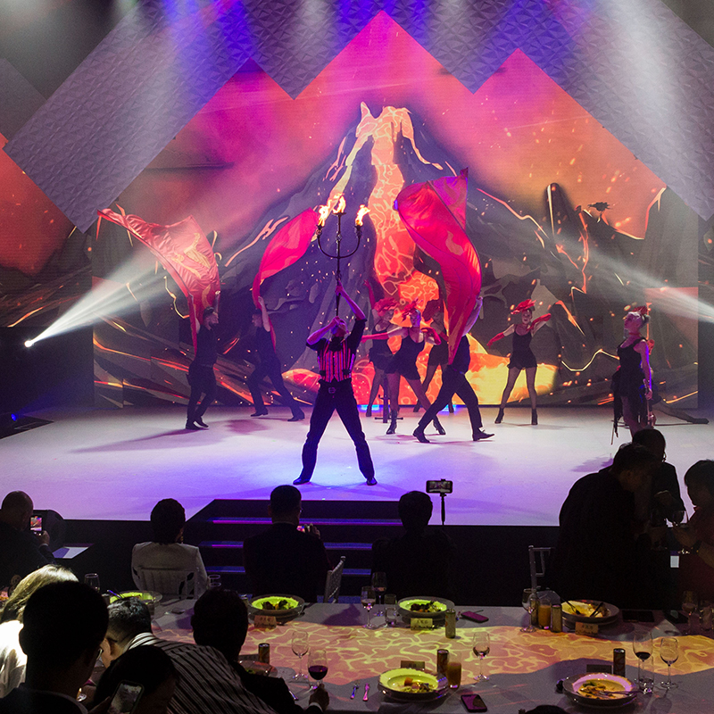 这些超大型活动耗费了 6000 多个工时,包括 155 平方米的 LED 屏幕、15 台 20K 投影机、80 台桌上投影机、8 台弧形屏幕投影机、4 台地面投影机、6 辆半拖车运输设备,甚至还有一个溜冰场。